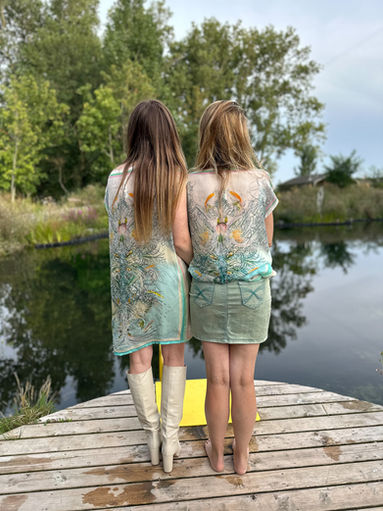 Souvenir Sauvage is een draagbaar kunstwerk van beeldend kunstenaar Joke Raes, gecreëerd op 100% zijde. Het werk is licht, ademend en voelt aan als een tweede huid — een zintuiglijke ervaring waarin verbeelding tastbaar wordt.